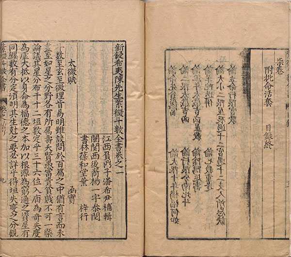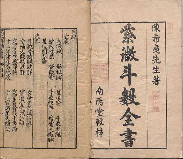 此《新锓希夷陈先生紫微斗数全书》托名宋初陈抟(希夷先生)著,由明代潘希尹补辑。全书共七卷,包含:太微赋、形性赋、斗数骨髓赋注解、定富贵贫贱等诀、安身命例、安十二宫例、论兄弟诀、论妻妾诀、论子女诀、论人命入格、古今富贵贫贱夭寿命图、批命活套等。此为明代南阳堂刊本,卷首题:江西負鼎子潘希尹補輯、閩關西後裔楊一宇忝閱、書林葆和堂葉梓行。