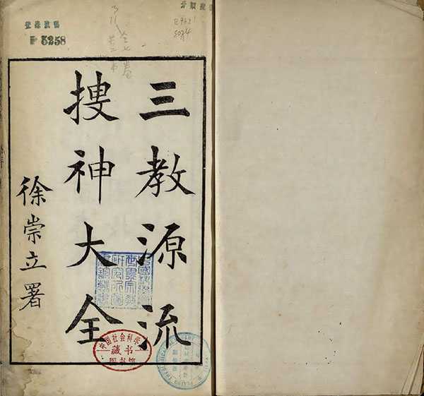 此《三教源流搜神大全》是中国叙述古代民间宗教人物列传和神仙事迹的著作典籍,元代成书,明代完本(1368-1644年),作者不详。全书共七卷,内搜集道、儒、释三教圣贤、世奉众神画画像计一百二十余幅,于每一幅神像后,于每一幅神像后,叙各神姓名、字号、爵里、封赠谥号,神灵事迹等。书中首列儒家孔子,次老子。所录众神,多取于小说杂记。