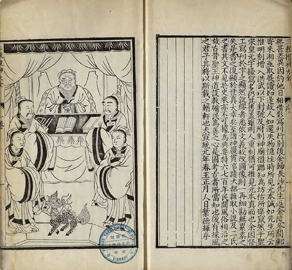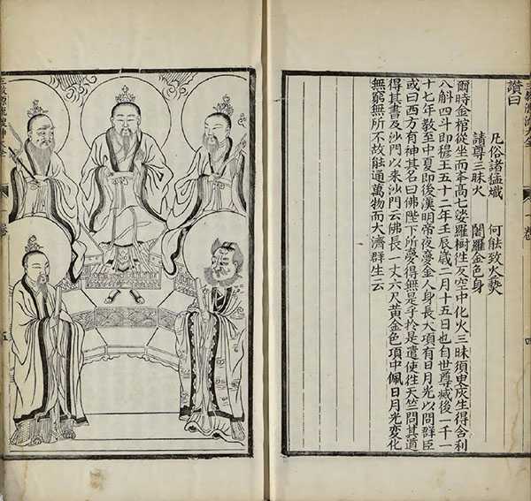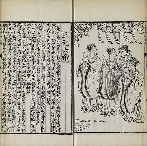 卷一首述儒、释、道三教源流,次收玉皇上帝、后土皇地祇、东华帝君、西灵王母、梓潼帝君、三元大帝等,有像十六幅。
