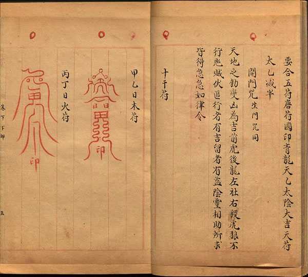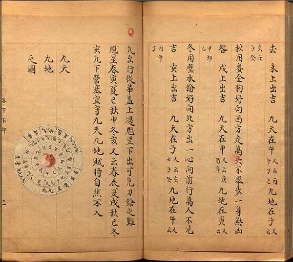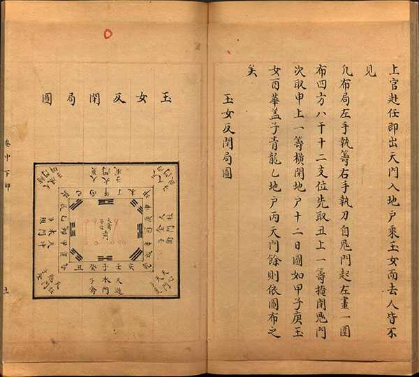 此《景祐遁甲符应经》旧题宋杨维德等撰,景祐是宋仁宗赵祯的年号。全书共分上下部,各三卷,其主要内容以奇门遁甲论行军趋避之用、百事凶吉,书内正文正楷墨书,图符朱书。