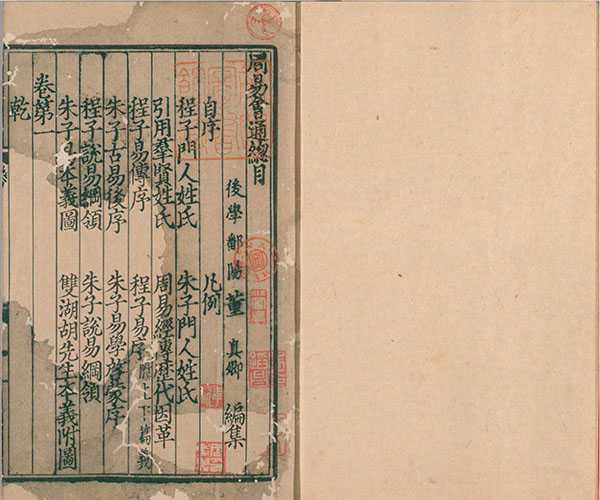 周易会通总目、周易经传集程朱解附录纂注序、凡例、群贤姓氏、周易经传历代因革、易程子传序、易程子序、古易朱子后序、易学启蒙序、程子易说纲领、朱子说易纲领、朱子易图附录纂注、双湖胡先生易图。