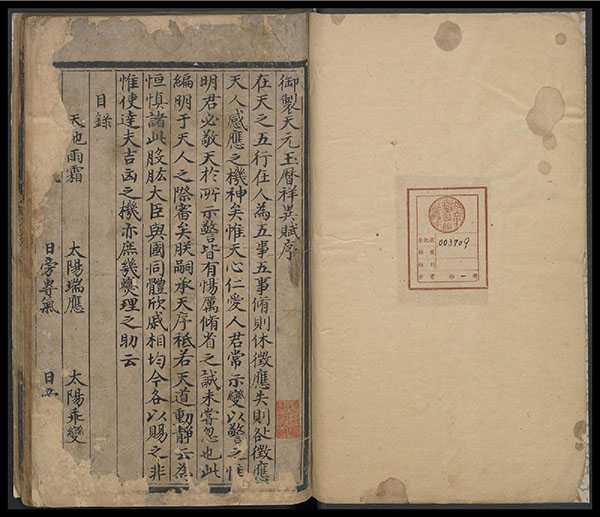 序跋信息:册首录载〈御制天元玉历祥异赋序〉。尾题「成化丁酉(1477年)岁中秋月望后二日李氏录于钝菴」。
