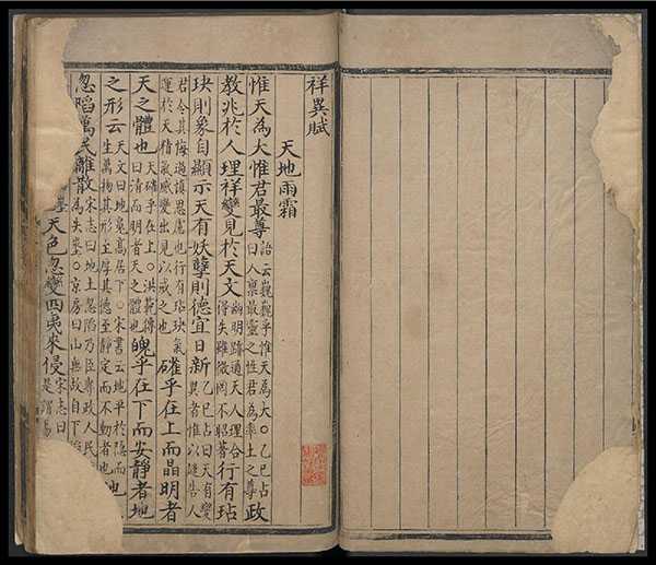 此《天元玉历祥异赋》不著撰人,传为明初军事策略家国师刘基(1311-75年)撰。此作品另有其它刊本,国家图书馆藏多部《天元玉历祥异赋》,其中有明万历四十七年 (1619年) 刊本。此本一冊,为明成化十三年 (1477年) 钞本,又称乌丝栏钞本,是现存较早且稀见的钞本,惟稍有破损。仅录六十条目,均多题有四字,如「天地雨雪」、「太阳瑞应」、「太阴休咎」、「岁星」、「五星凌犯」、「流星飞星」、「军胜气象」、「吉凶气象」、「虹蜺」与「占风」等。全书深受天人感应观念及采录吉日原则的浸染。