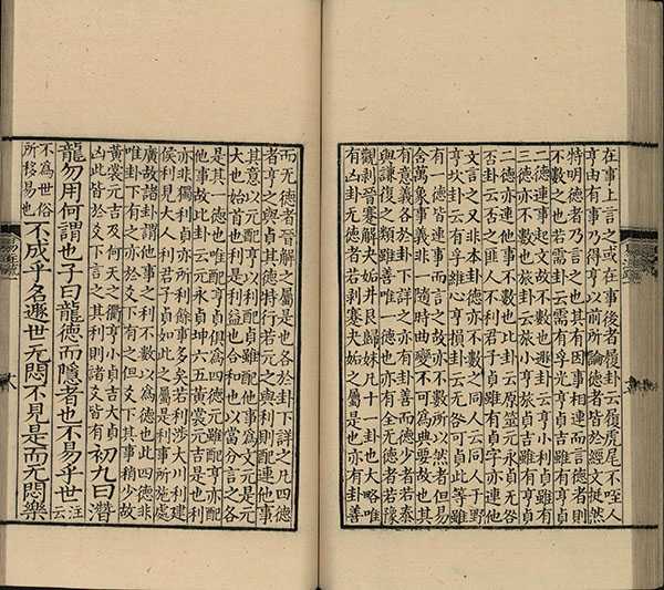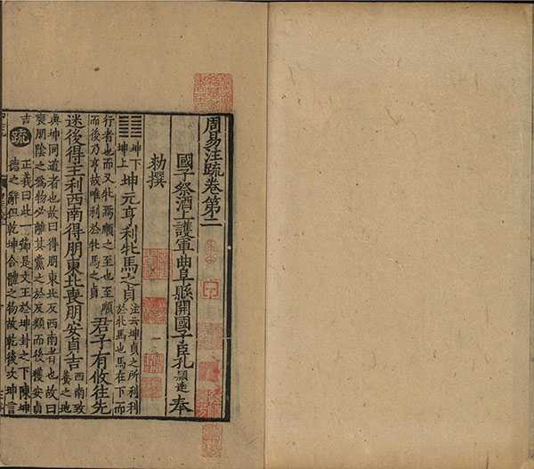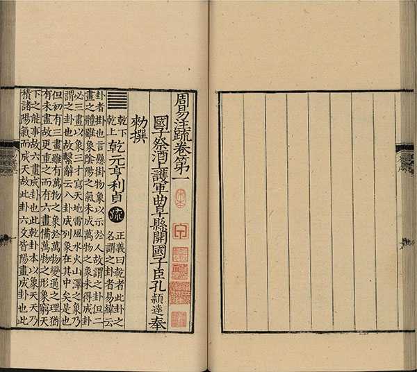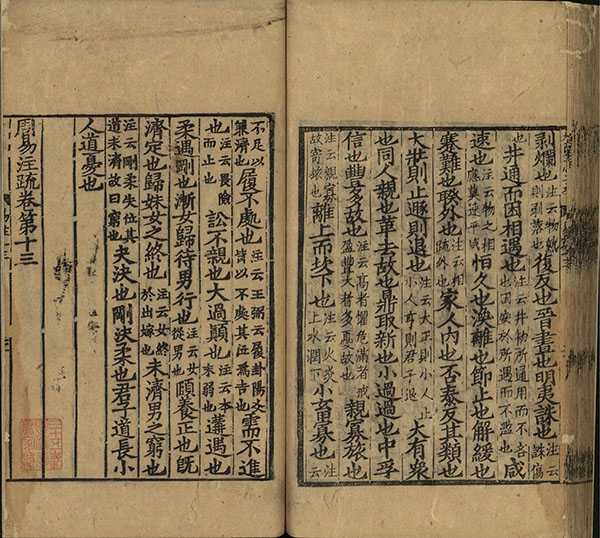 此《周易注疏》为魏王弼作注,始以义理说《易》,后晋韩康伯作注,至唐孔颖达作疏。全书共十三卷,附卷首,内容包括经、传两部分,六十四卦三百八十四爻,附卦辞、爻辞为经。此为南宋初两浙东路茶盐司刻(递修本),现藏于中国国家图书馆。