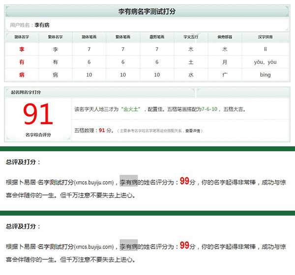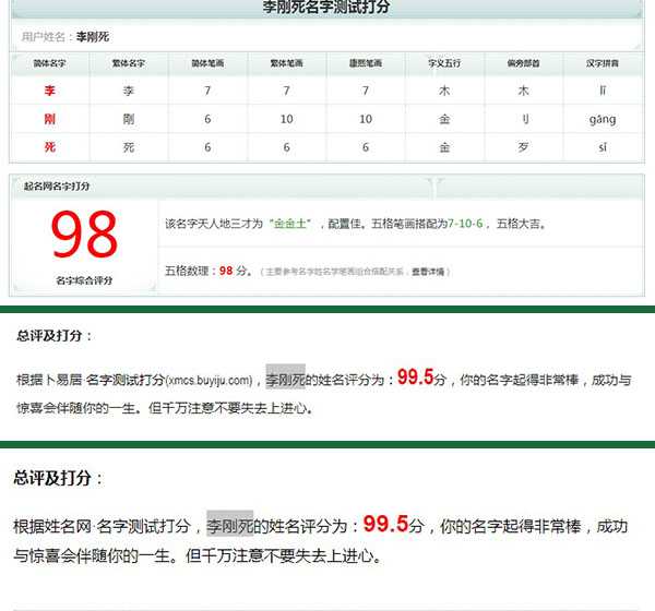 经过调查,这些姓名测试打分服务基本上都是用五格剖象起名法编写的电脑程序,其原理是根据名字的笔画数,按照一定的规则计算出天格、地格、人格、总格和外格这五格数字,然后对应其数理规则即可计算吉凶,具体可参考这篇文章:五格剖象起名法详解。那么,这种五格剖象起名法可信吗?