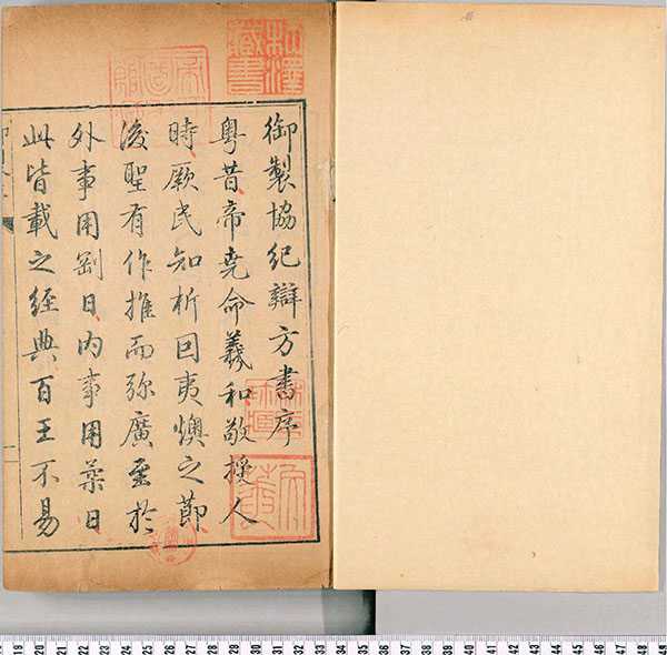 此《钦定协纪辨方书》共三十六卷,为中国古代典籍中集大成之作,主要内容为择吉、选择用事之用。于清乾隆四年(公元1739年),由庄亲王允禄奉敕带领几十名学者和官员历时三年多编撰而成,乾隆亲制序文。 收于《四库全书》第八百八十一册(子部)。其内容破除了术数家繁碎拘泥、附会假借之说,删除了神煞、俗论及多相矛盾之处,而以五行生克衰旺之理来谈趋吉避凶之道。
