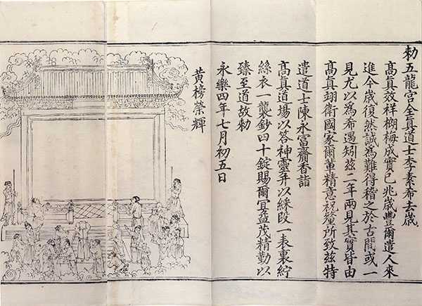 圆光屡现:从永乐十一年五月到八月,武当山金顶、紫霄、南岩、五龙宫,多次出现五色圆光,有些人还在圆光里面看到玄天上帝在里面,两边还有执旗和捧剑的。最后有人把它画成了《武当山圆光图》献给朝廷,这个圆光图现在还保存在北京白云观的博物馆里面。这种瑞应的故事,反复的宣传,实际上是进一步的来营造道教神灵保佑朱棣当皇帝,保佑永乐皇朝。