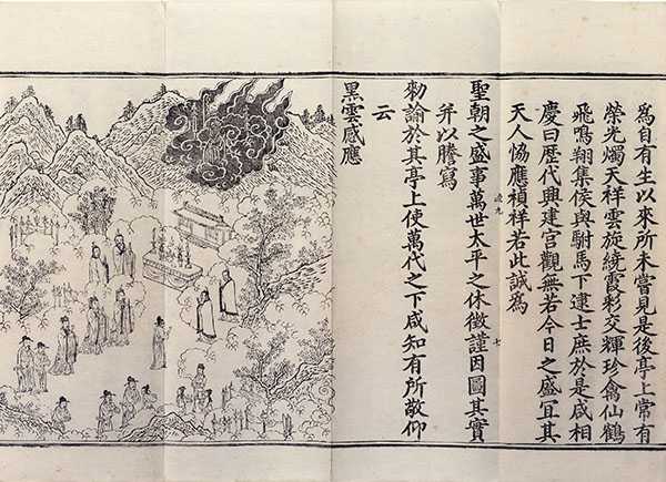 此《大明玄天上帝瑞应图录》一卷,原不题撰人,从内容看,应为明永乐年间道士编撰。收入《正统道藏》洞神部记传类。本书记述明初修建武当山官观时出现各种祥瑞,如黑云感应、骞林应祥、樃梅呈瑞、神留巨木、水涌洪钟等,皆绘成图画(凡十七图)进呈朝廷,书末附载明成祖御制《真武庙碑》文。此书不仅有宣传教义的功用,也是珍贵的道教历史文物和艺术珍品。