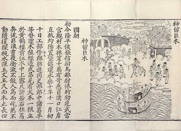 神留巨木:修武当山的很多木料,都是在四川砍伐的,先在长江上放木排顺流而下,到了汉口这些木排要被截住,然后再顺着汉江运到武当山。有一根木材很奇怪,到了汉口它不是像别的木头横着浮在水面上,而是直直的站在水面上。当时有个官员叫诸葛平,他派人到水下看,这个木材下面还有几尺高,没落到底,觉得很奇怪,就说是神把这个木料留下来,用于武当山的宫殿建筑。所以说就搞了一个绳索,把这个木料拴着,拖到了武当山,接到武当山最大的一个道宫玉虚宫里面,作为它的正梁,在《武当山瑞应图》里面,有很多船拉着木料从黄鹤楼经过的画面。