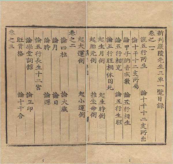 卷之一:说五行所生,论十干十二支所出,论十干十二支所属,论甲子纳音成数,论五行相生,论五行相克,论五行生旺,论五行旺相休囚死,起生月例,起生时例,起胎元例,推坐命例,起大运例,起小运例。