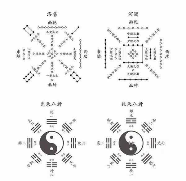 相传最初的易经八卦被称作先天八卦,是根据河图、洛书推演出来的。先天八卦图就是一、二、三、四为逆时针(左旋),五、六、七、八为顺时针(右旋),与河图的一到八的排列次序一样。到了后来,人们又根据先天八卦和洛书推演出了后天八卦。后天八卦图的逻辑也就是一、二是逆时针,三、四是顺时针,五、六与七、八都是顺时针。 和先天八卦相比,后天八卦的次序明显复杂了:一和二之间、二和三之间、九和六之间、七和八之间都隔着两卦。后天八卦与先天八卦唯一相同的数字是三。