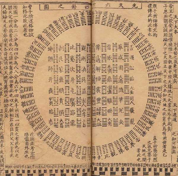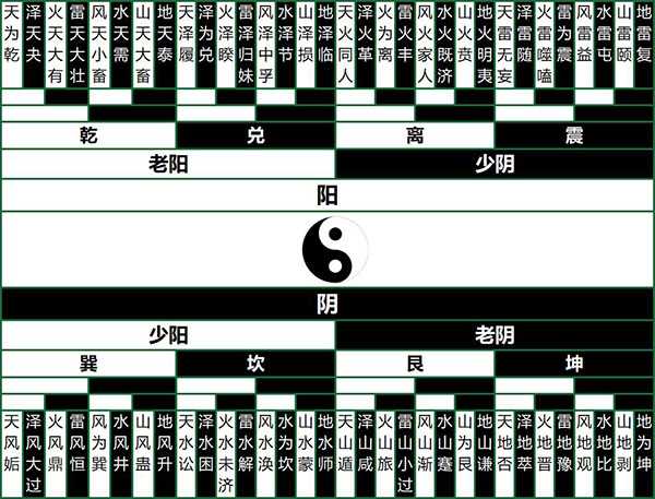 两个八经卦上下相叠,上面的经卦叫外卦或上卦,下面的经卦叫内卦或下卦,这就构成了六十四卦,也叫复卦或重卦。每个六十四卦都由六个爻从下向上排列而成,依次叫做“初、二、三、四、五、上”。六十四卦共有三百八十四爻,以此穷尽天下万物之象。