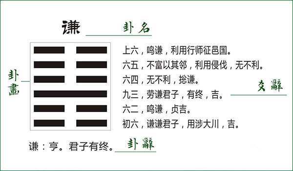 卦辞是对卦总体吉凶的判断。如乾卦的卦辞是“元、享、利、贞”。每卦的六爻象征不同的事物,也代表不同的吉凶,爻辞就是对各爻的分析说明。卦辞和爻辞都非常简要精炼,是《易经》的精华,是判断吉因的主要依据。