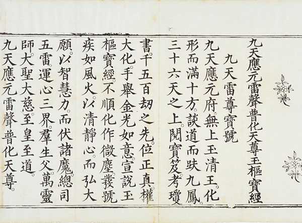 普化宝诰:九天应元府,无上玉清王。化形而满十方,谈道而趺九凤。三十六天之上,阅宝笈考琼书。千五百劫之先,位上真权大化。手举金光如意,宣说玉枢宝经。不顺化作微尘。发号疾如风火。以清静心,而弘大愿,以智慧力,而伏诸魔;总司五雷,运心三界,群生父,万灵师。大圣大慈,至皇至道,九天应元雷声普化天尊。