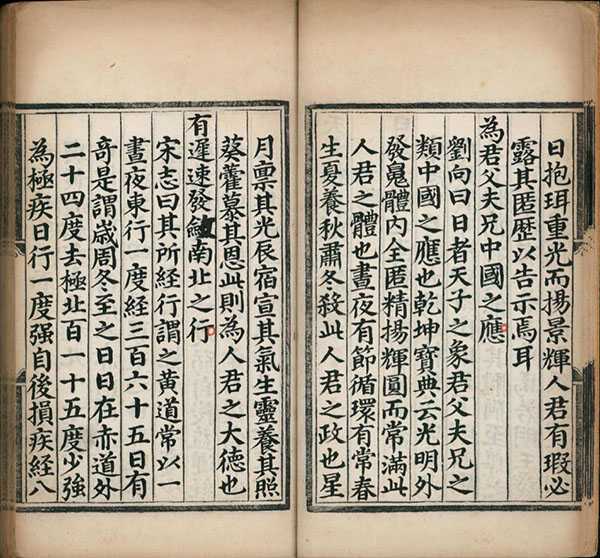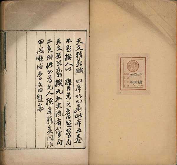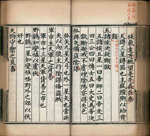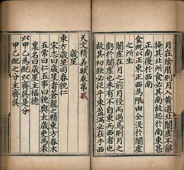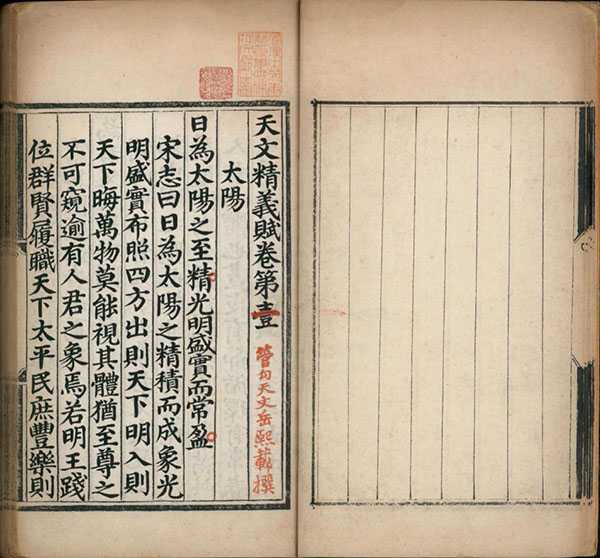 此书首页有同治十三年(1874 年)甲戌李文田题记,指出《四库全书》以《天文精义赋》作四卷,此本则五卷。因元代太史院有管勾二员,故定为元人所撰。首天体,次分野,次太阳、太阴,次概举七政,及于恒星,而以凌抵、斗食之说附於其末。全书类似纲目体,先有本文,注解低一格。例如卷一首论太阳,引《宋史艺文志》“日为太阳之精,积而成象,光明盛实,布照四方”。其中引用人物与书目如刘向、《纪元历》、《唐书历志》。卷二论岁星、熒惑、填星、太白与辰星、岁星 “司春貌仁”、熒惑 “司夏令而视礼”、填星 “主季夏而思信”、太白 “秋金西方言义” 及辰星 “司冬为听主智”。卷三论紫微垣、太微垣、天市垣、列舍与附官,列舍二十八宿依序例角、亢、氐、房、心、尾、箕、斗、牽牛、女、虛、危、室、壁、奎、娄、胃、昴、毕、觜、參、井、鬼、柳、星、张、翼、軫。附官则有钩铃、神宮、离宮等。卷三也引用人物及书目,包括李巡、《元命包》、《春秋纬》、《后汉志》、《隋书天文志》等。卷四论东南西北方杂座与占例。卷五论气之远近与占例。又论推测占验之术,而以赋之。