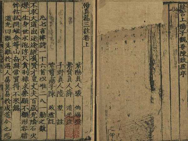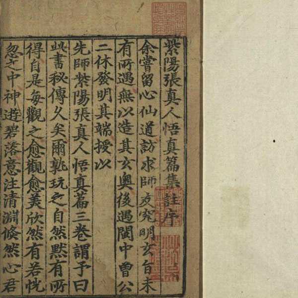《四库全书·总目提要》谓之:“是专明金丹之要,与魏伯阳《参同契》,道家并推为正宗”。《悟真篇》与《周易参同契》、《老子河上公章句》、《黄庭经》并为中国古代早期四大内丹术专著。此书专明金丹之要,被推为道家正宗,又得薛、陆、陈三家先后注释,发泄玄蕴,表里焕然。初以抄本流传,讹误颇多,其注释或文义不相连属,或与正文支离,或漏落重复。元还阳子魏伯真始为之校正,刻梓流布,惜其刻书之序未署年月。后来传本皆有魏序,知皆从其所出。此为黄麻纸印本,刻印远较《中国古籍善本书目》著录之成化本为早。旧藏吴兴刘氏嘉业堂,缪荃孙定为元刻本,应不误,颇疑此即魏刻原本。