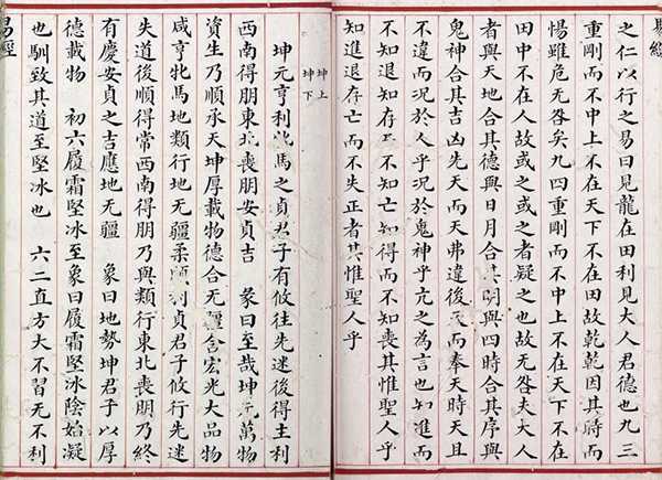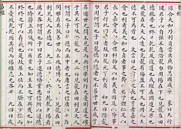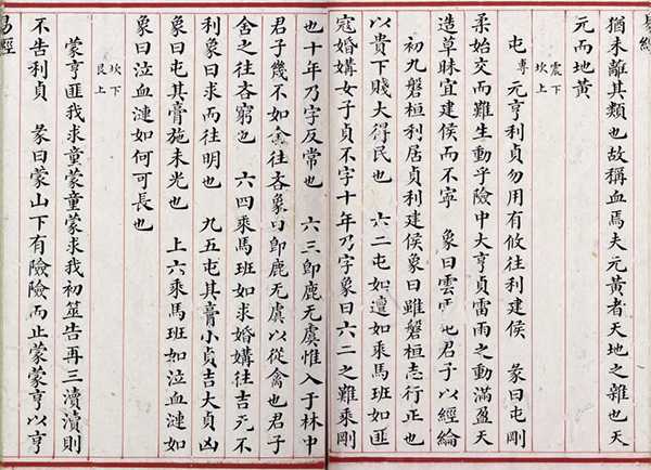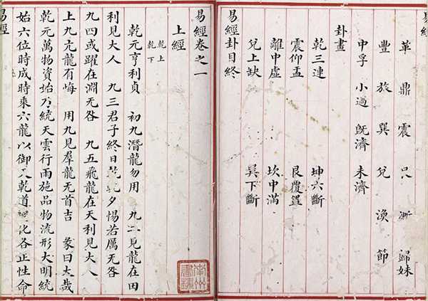此《易经》三卷,为清道光年间文源阁朱丝栏五经精写本。文源阁是清代专藏《四库全书》的书阁之一。于乾隆三十九年(1744)在圆明园内原有建筑四达亭的基础上略为增葺,于次年继文津阁之后告成的,为七阁中建成的第二座。位置在全园的西北,南接水木明瑟,西临柳浪闻莺。公元1860年被英法联军焚毁,现仅存遗迹。