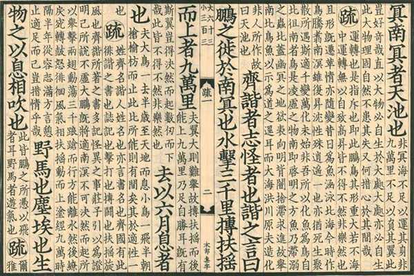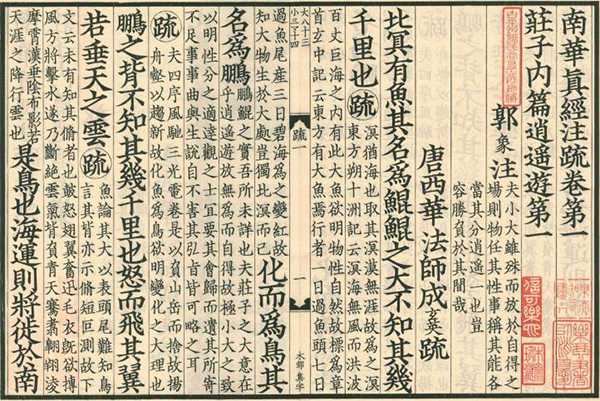 此书为黎庶昌与杨守敬据日本赐芦文库所藏南宋残本 (今藏静嘉堂文库),及日本万治坊刻本《庄子注疏》三十三卷,参校《正统道藏》本《南华真经注疏》三十五卷,依照宋本字体板式重刻而成,黎庶昌延请日本著名刻工木村嘉平操刀刊刻。此书虽名为疏,实则并非严格依注解经,而是用浅显的文字顺述口吻,诠释词义及篇章旨趣,类似现代的 “古文翻译” 或 “轻解” 之类,对初读庄子者用处颇大。当年刊刻《古逸丛书》时,黎庶昌称赞此书 “称意而谈,有郭象注解之曲畅而不蹈其玄虚,有林希逸《口义》之显明而不至流于鄙俚”,评价甚高。