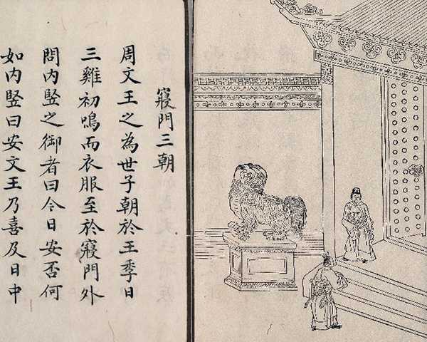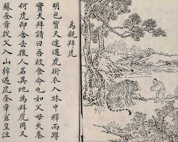 此《百孝图》由清代俞葆真编,何云梯绘图,是清代劝孝类书版画精品。全书分元亨利贞四卷,共选录上古至明代孝行卓著者百人百事,如:象耕鸟耘、寝门三朝、卖身葬父、竹筒寄鱼、为亲拜虎、卧冰求鲤、代父从军、博施锡类等等,旨在宣扬孝道,右图左文,刻绘细腻。