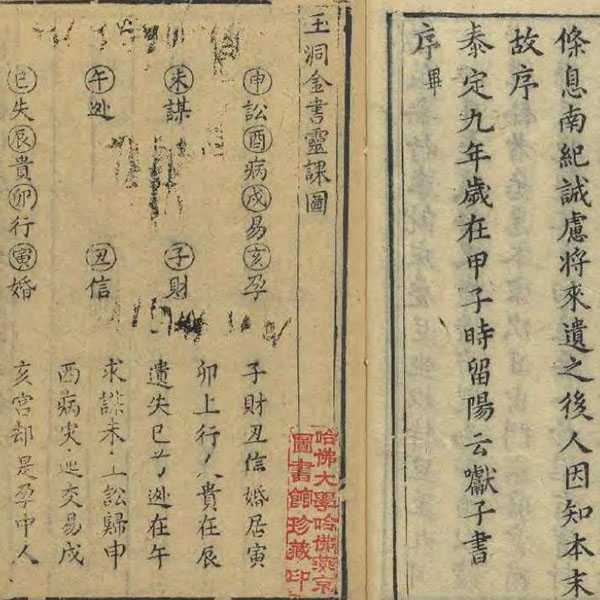 此《新刻玉洞金书》一卷,为明代刘基撰、胡文焕文会堂校刊的占卜预测类典籍。关于此书,明代著名史学家、藏书家和目录学家黄虞稷所著的《千顷堂书目》有所记载,即《千顷堂书目·卷十三·五行类·第一》,原文记载为:“刘基玉洞金书一卷”,署名为刘基。另近代著名学者汪超,在学界泰斗饶宗颐先生所著《全明词》的基础上,所著《全明词未收词作缀补》中亦有全文收录,署名为刘海蟾。