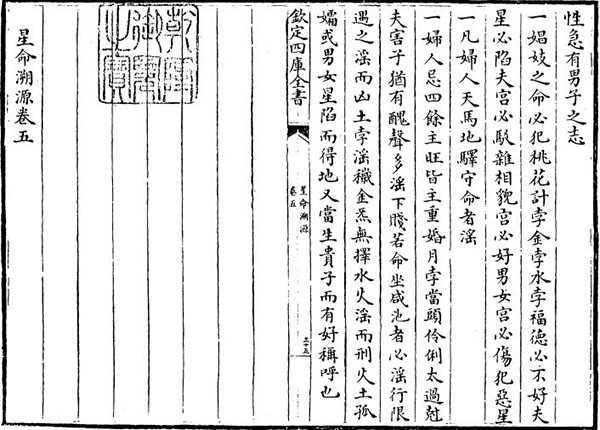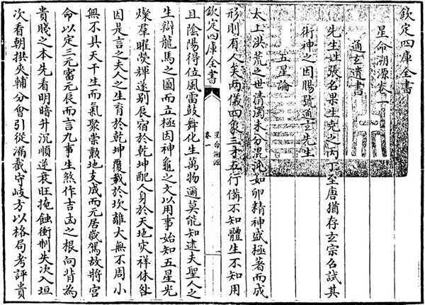 此《星命溯源》共五卷,又题作《星命渊源》,撰者不详,不知成书于何时,明以前未见著录,清代编《四库全书》时收到浙范家藏本,即天一阁藏书,此后未见刻本。整个清代只有两种抄本,可见其流传甚稀。该书以五星推人禄命,为算命术流派之一,明以后谈五星者,皆以此书为鼻祖。《四库总目提要》认为,此书大概为元代郑希诚撰,明代术士又掇拾增补而成。