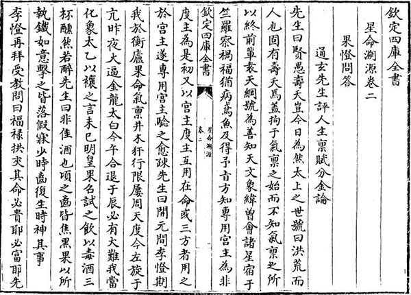 卷二为《果蹬问答》,即张果与李橙的问答,内容包括《评人生禀赋分金论》、《至宝论》、《五星先天口诀》、《后天口诀》。这是张果对李憕当面教授讲解星命术的实录,中间反映了张果的星命观和星命技术。