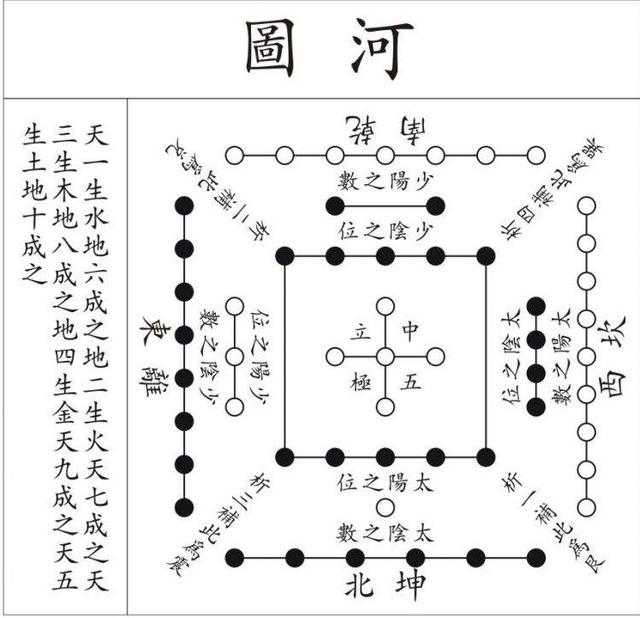 十干之合源于河图。河图之数,一六居北,二七居南,三八居东,四九居西,中央五十。其中一二三四五为生数,六七八九十为成数,成数源于生数,因为四方中,土为中央,为五数,故生数加五即为成数,如一加五为六,二加五为七。河图先天之道,反映的是阴阳生四象后,先天阳气的运行变化规律:四象从太阴之水开始,从静到动,依次而生为太阳之火,少阳之木,少阴之金,然后四象之气混合在一块,冲气所结而归于土。所以河图先天数与五行的对应关系就成了:天一生水,地六成之;地二生火,天七成之;天三生木,地八成之;地四生金,天九成之;天五生土,地十成之。