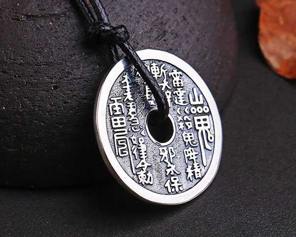 此纯银八卦山鬼花钱护身符选用S925纯泰银,采用硫化复古工艺精制而成,正面为八卦卦爻和卦名,背面为“雷霆雷霆,杀鬼降精,斩妖辟邪,永保神清,奉太上老君急急如律令敕”字样的山鬼雷令符咒,钱币中央有一圆孔。此纯银八卦山鬼花钱护身符铸造精美,造型独特,字迹笔画清晰均匀,小巧轻便,易于佩戴,挂于家中或随身携带,具有辟邪、祈福、镇宅的风水理气功效。
