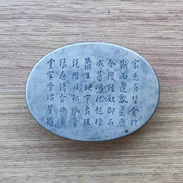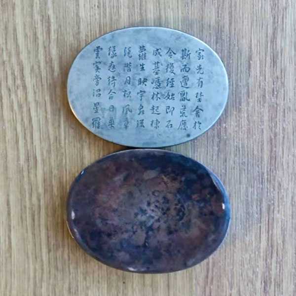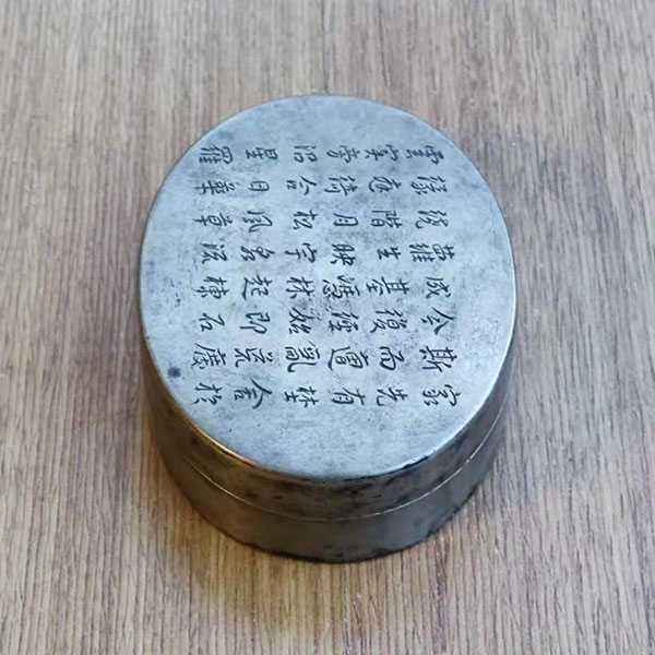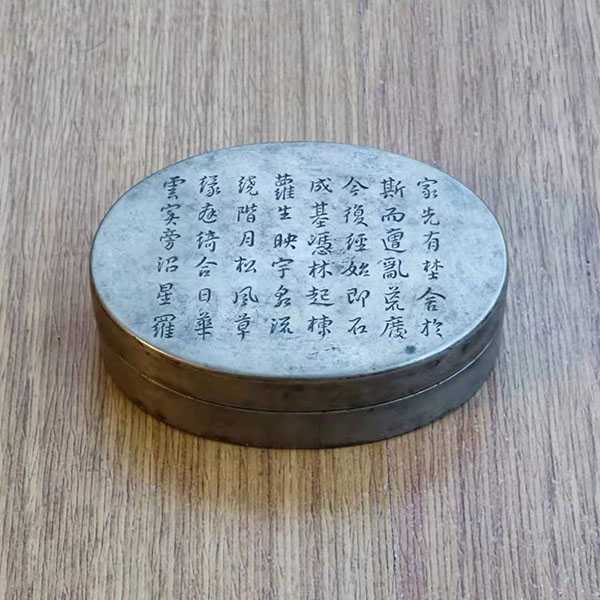 此白铜墨盒为纯手工精制而成,质地细腻手感润泽,雕刻工艺精湛,字体清晰雅致,包浆自然厚重。