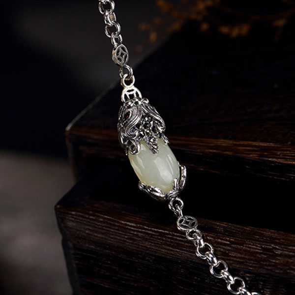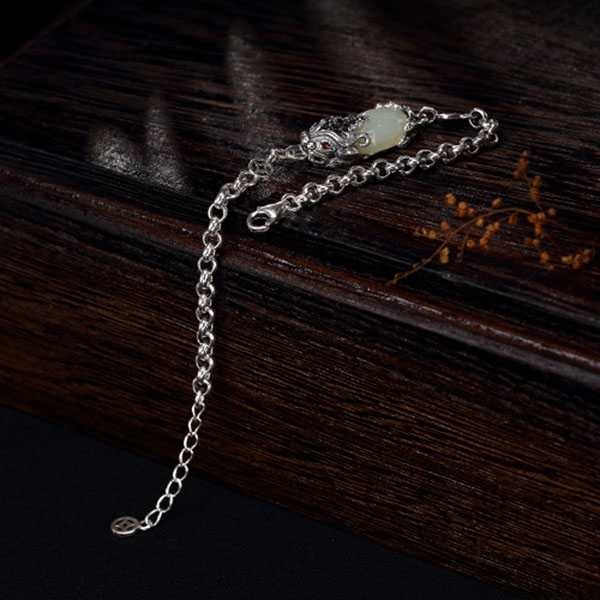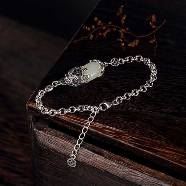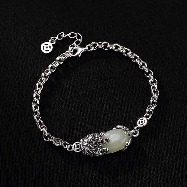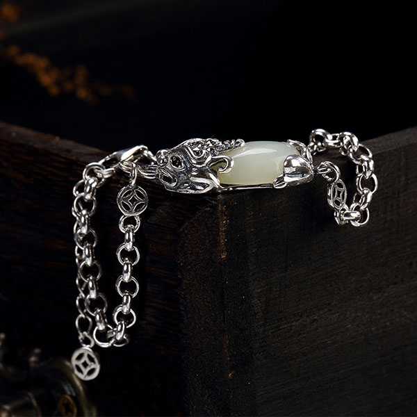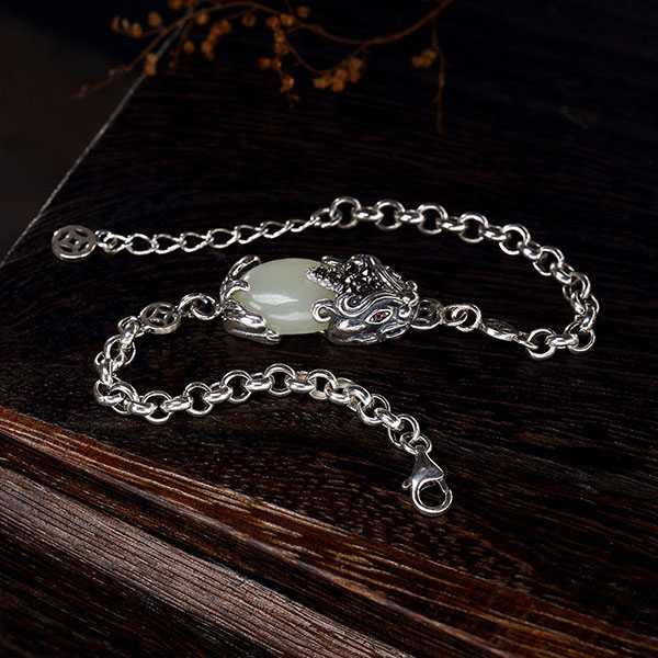 此白玉貔貅银手链选用和田白玉和S925纯银,纯手工精制而成,质地纯净、光洁细腻,纹饰图案细致,设计精美别致。其造型为上古神兽貔貅,寓意招财聚宝,财源广进,辟邪开运。玉五行属土,对八字喜土者具有提升气运、护佑平安和改善五行气势的作用。