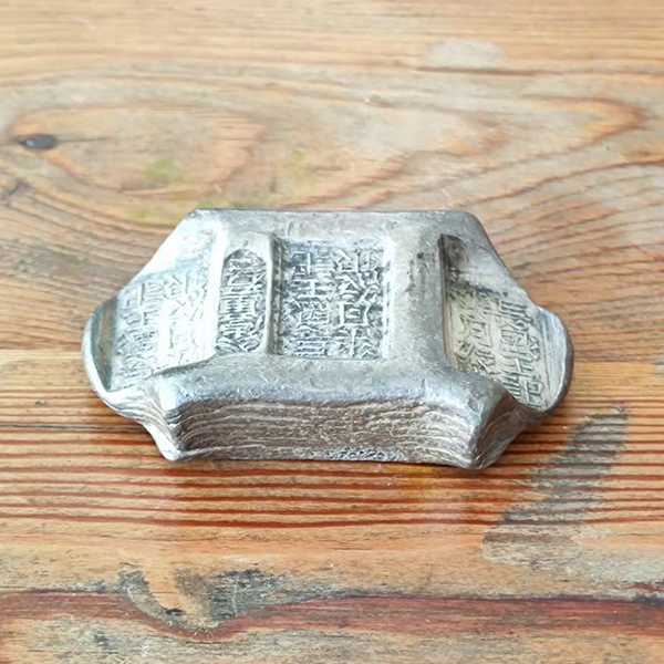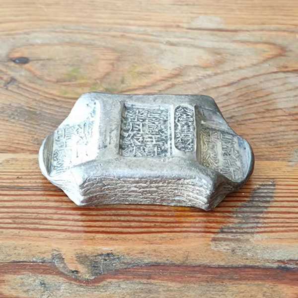 此云南长盛王记五两牌坊银锭为方槽铸坯,造型优美,铸造精良,印“长盛王记七月纹银”,单梁打“公估童看讫”,文字规整清秀,整体完好,锭面光洁,包浆自然,品相一流,月份锭为云南地区特有,较为少见。