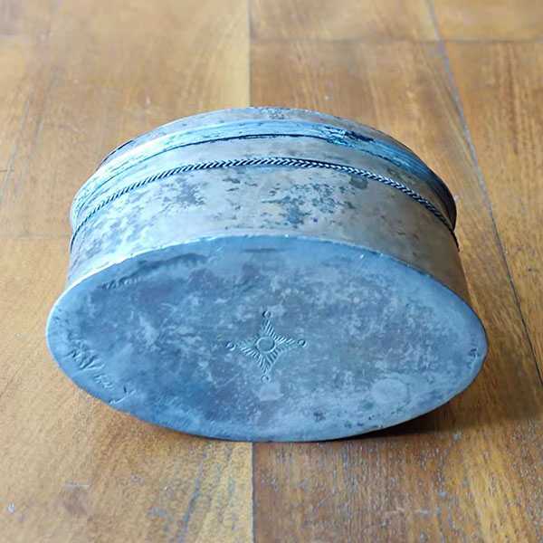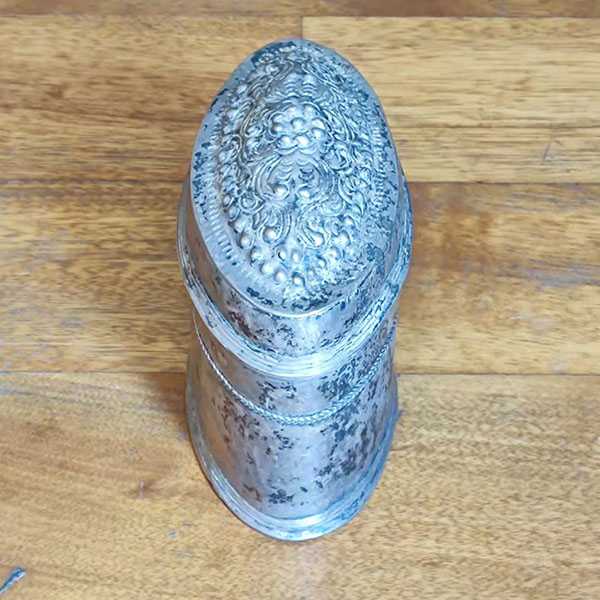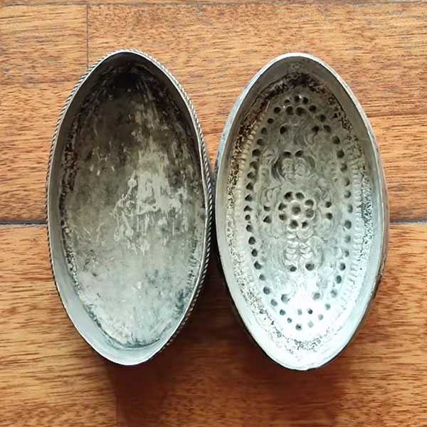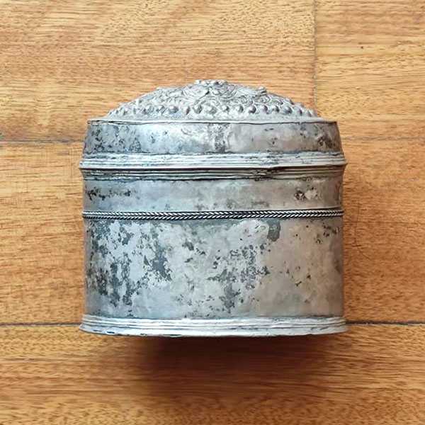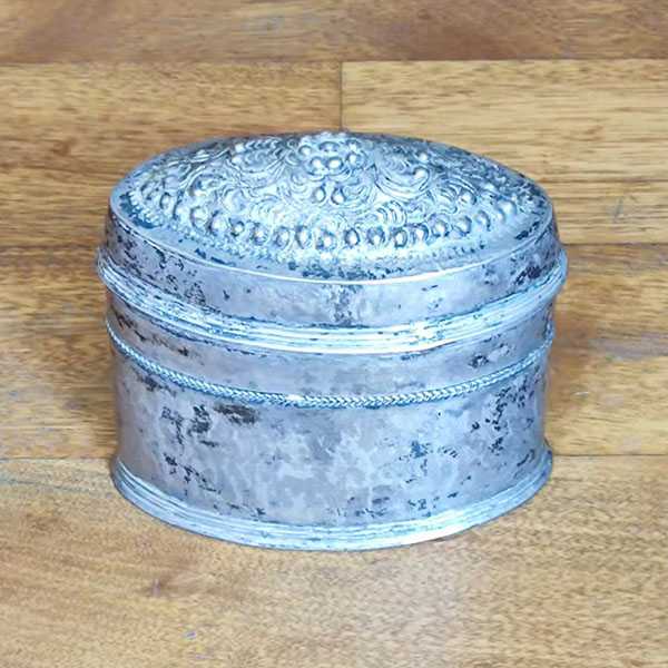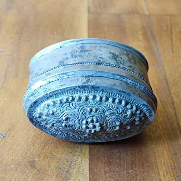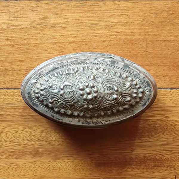 此纯银花卉纹烟膏盒为纯手工精制而成,造型古朴,雕刻工艺精湛,纹饰清晰饱满,线条舒展流畅,包浆自然厚重。盒体为椭圆形,盒盖雕刻花卉纹饰。银五行属金,对于八字喜用为金者,具有提升气运、护佑平安和改善五行气势的风水理气功效,另据《本草纲目》中记载:“银有安五脏、安心神、止惊悸、除邪气等作用”。