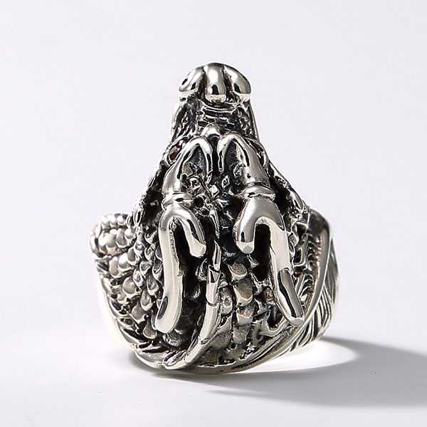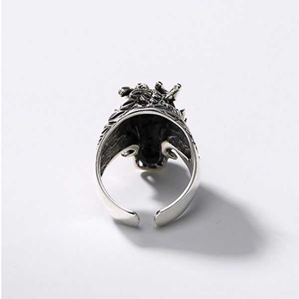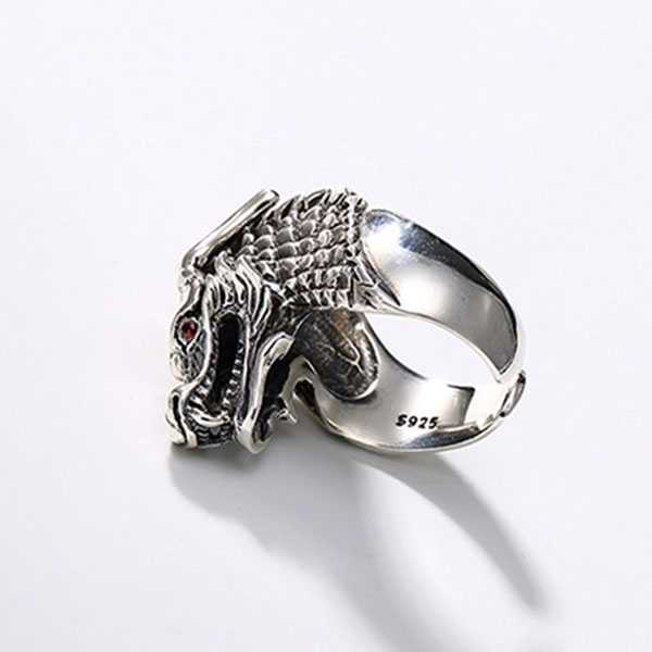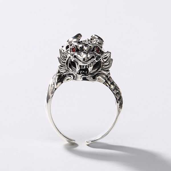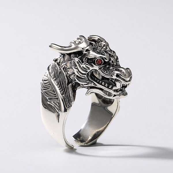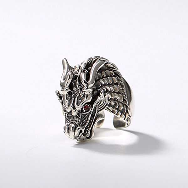 此纯银龙头戒指选用S925纯泰银,纯手工精制而成,银质纯净,工艺细腻,纹饰图案清晰均匀,设计精美霸气。戒面雕刻龙头纹饰,龙眼饰以红宝石,寓意祥瑞如意,具有祛邪避灾、祈福纳吉的风水理气功效。
