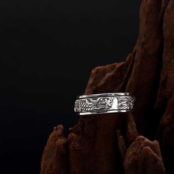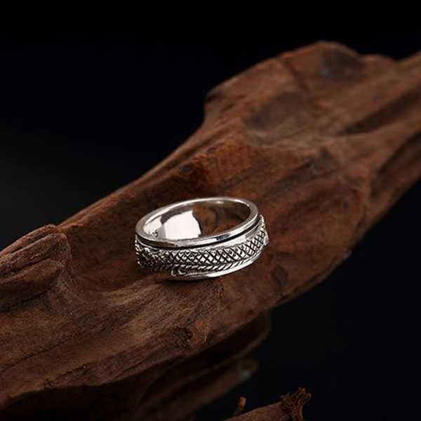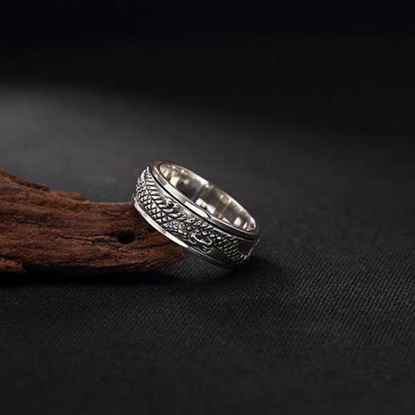 此纯银盘龙戒指选用S925纯银,纯手工精制而成,银质纯净,工艺细腻,纹饰图案清晰均匀,设计精美霸气。戒面雕刻盘龙浮雕图案,寓意祥瑞如意,具有祛邪避灾、祈福纳吉的风水理气功效。