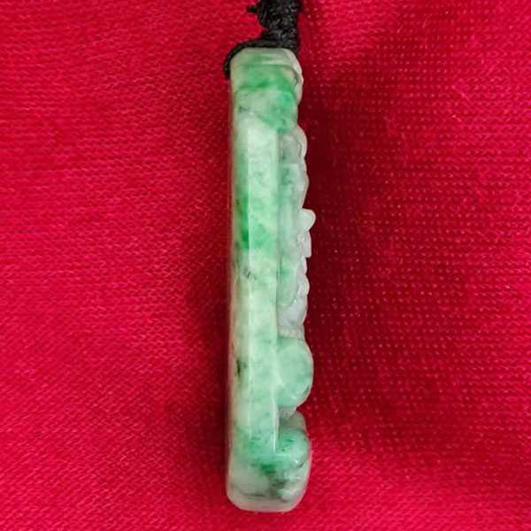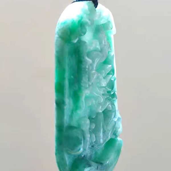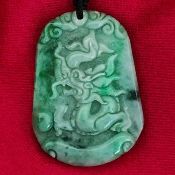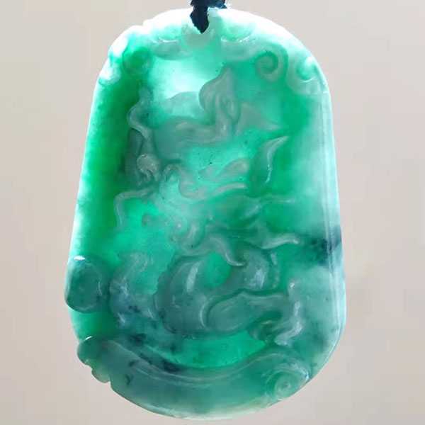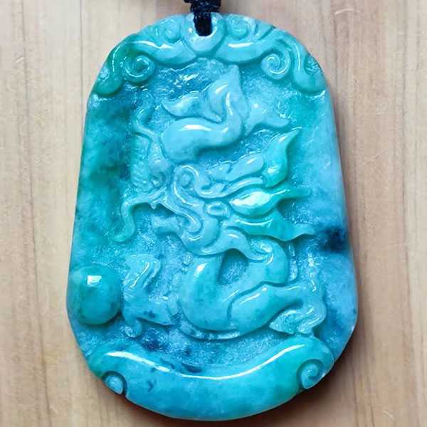 此翡翠蛟龙吊坠选用缅玉翡翠,纯手工雕刻而成,质地坚硬,色泽晶莹通透,工艺细腻,造型古朴优美。正面雕刻蛟龙纹饰,寓意祥瑞如意,具有祛邪避灾、祈福纳吉的风水理气功效。