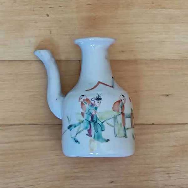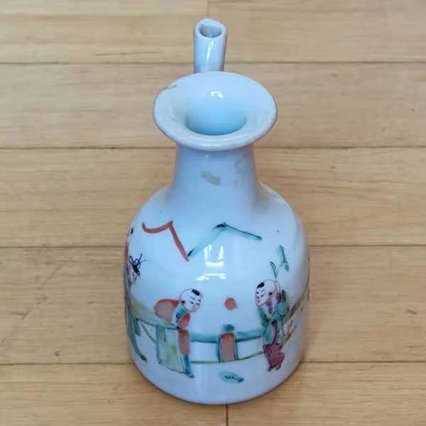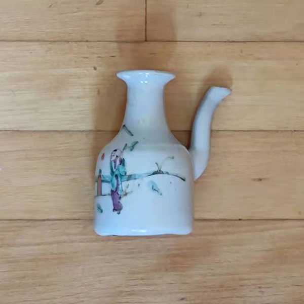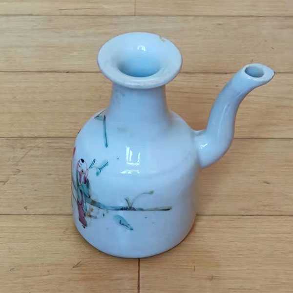 此粉彩人物酒壶形制规整,釉质温润,发色纯正,包浆自然,保存完好无磕裂。壶身绘有人物图案,神态生动传神,画工精湛简练,色彩柔和淡雅。