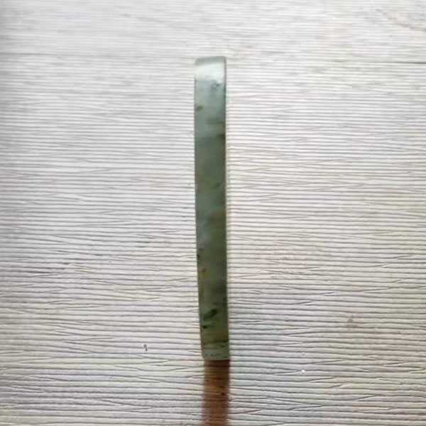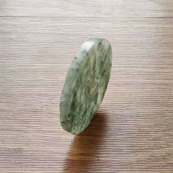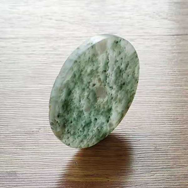 此翡翠无事牌选用缅玉翡翠精制而成,质地坚硬,表面光滑,无雕刻纹饰,色泽通透,冰种飘青、白花。翡翠五行属土,对于八字喜用为土者,具有提升气运、护佑平安和改善五行气势的风水理气功效。