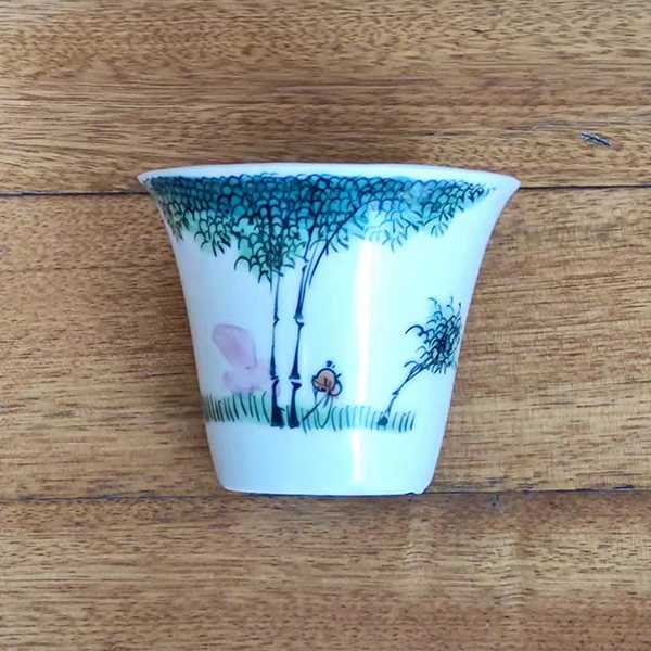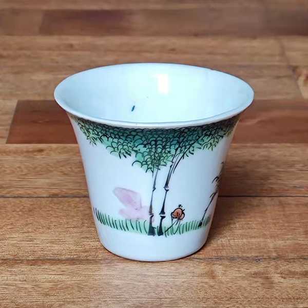 此粉彩竹枝人物马蹄杯敞口,斜削腹,圈足,呈倒置,似马碲状,胎骨轻盈,釉质洁白细腻,釉色甜润,纹饰线条清晰流畅,保存完好无磕裂。外壁饰粉彩竹枝人物图案,画工洒脱写意,构图简洁雅致,人物形象生动传神,晕色渲染巧妙,意境清淡幽远。