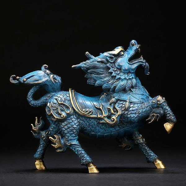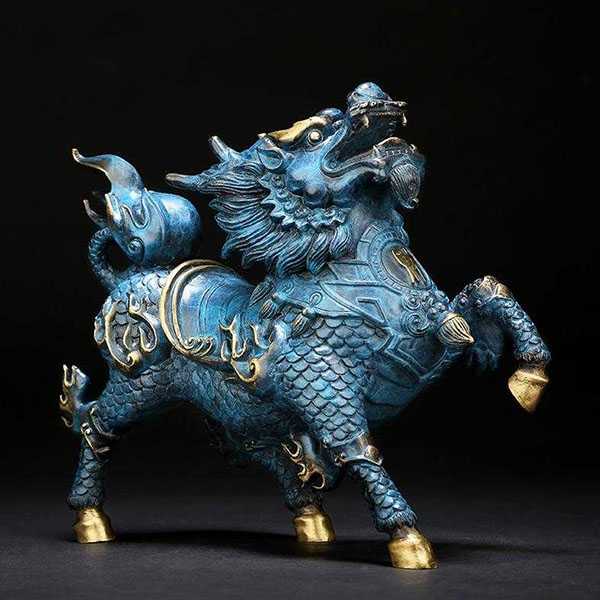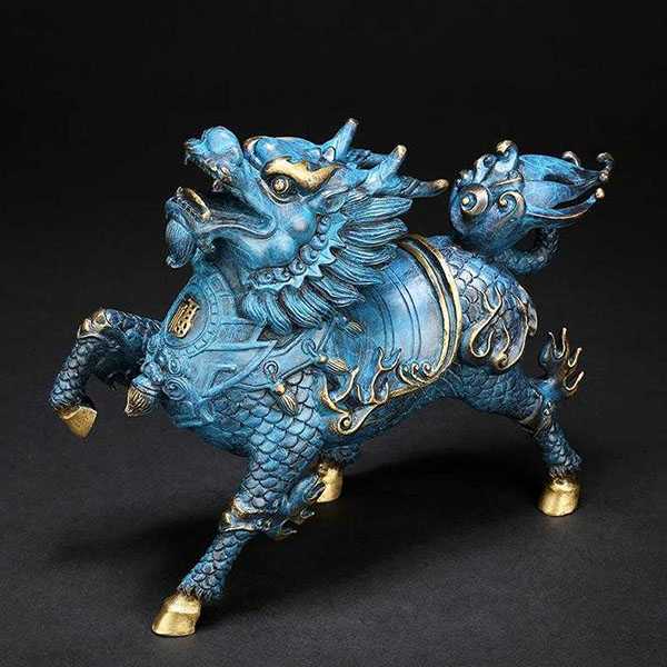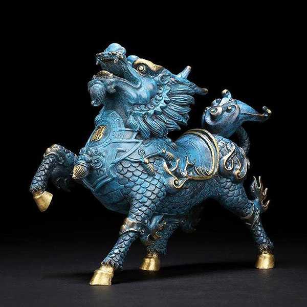 麒麟是古代传说中的一种神兽,龙首鹿身,头上有角,身有鳞甲,尾像牛尾。古人认为,麒麟出没处,必有祥瑞,故也被视为代表仁义、吉祥、太平和长寿的瑞兽。《宋书》云:“麒麟者,仁兽也。牡曰麒,牝曰麟”。麒麟因其深厚的文化内涵,常被制成各种饰物和摆件,其形象神态庄重,威而不猛,泰而不骄,贵而不俗,灵而不钝,蕴含着自强不息、厚德载福,向往盛世、平和可亲的精神,体现大中华风范。