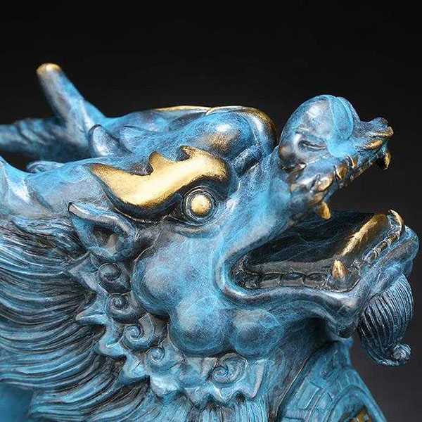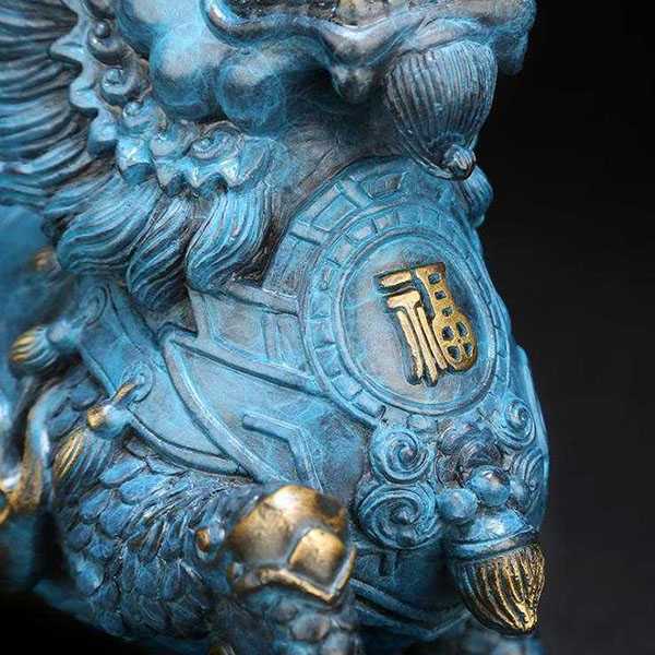 此全铜风火麒麟摆件选用62国标新铜,纯手工精制而成,设计精美,细节考究,神态生动,精雕细琢,高温烧色不褪色,手感润泽而有层次感。其造型为麒麟昂首阔步,寓意催财升官、招财送子、祥瑞平安和富贵长寿,具有辟邪化煞和镇宅开运的风水理气功效。