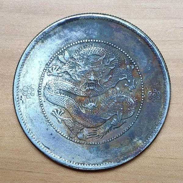 此云南省造光绪元宝库平七钱二分银币铸造于1911年,为新版火珠下四圈,铸造精美,打制深峻,原味包浆,局部带彩,银光颇佳,品相上佳,极具收藏价值。此币背面为蟠龙图,龙图完整精美,龙爪张扬,神武有力,龙鳞雕刻细密有致,龙身盘踞太阳,腾云驾雾,身姿遒劲有力,尽显皇家威严大气。