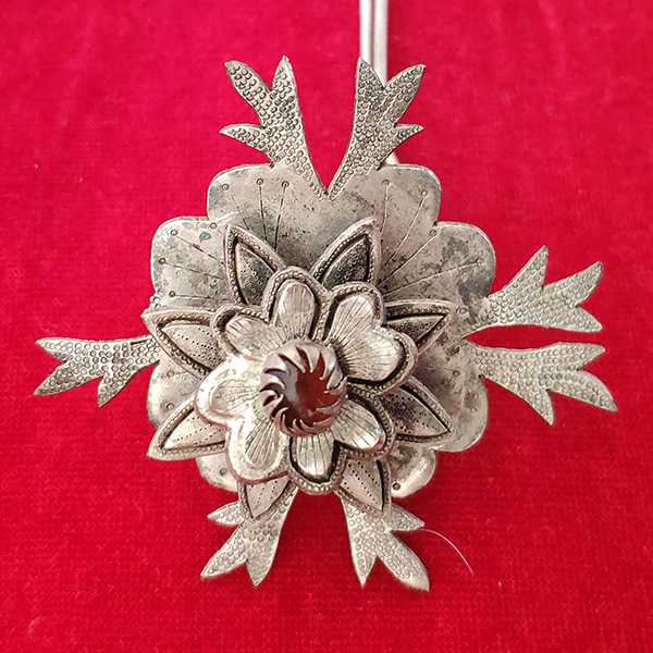 此红宝石银发簪为纯银手工精制而成,纯度高银色正,设计精巧,工艺细致,纹饰清晰,包浆自然。其造型为牡丹,花心饰以天然红宝石,寓意祥瑞如意,辟邪化煞。银五行属金,对于八字喜用为金者,具有提升气运、护佑平安和改善五行气势的风水理气功效,另据《本草纲目》中记载:“银有安五脏、安心神、止惊悸、除邪气等作用”。