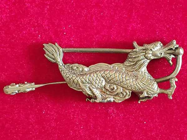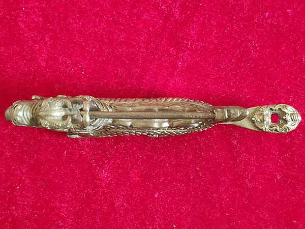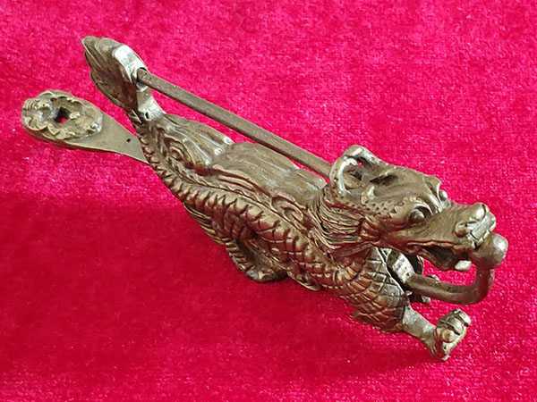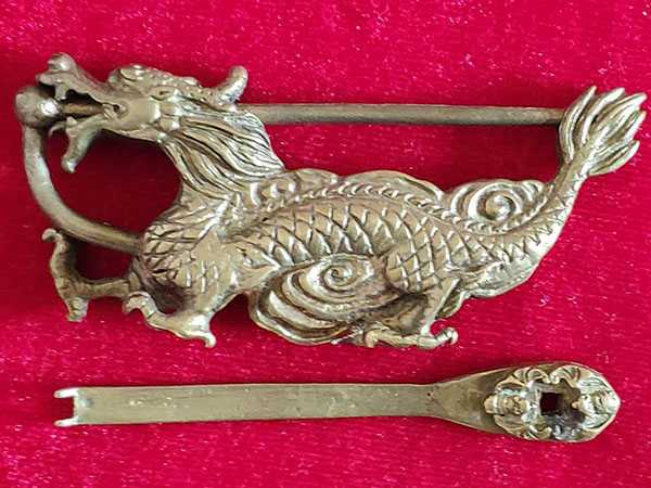 此黄铜蛟龙锁包浆自然,工艺精美,尚能正常使用。其设计构思精妙,拙中藏巧、朴中显美,寓意镇宅辟邪,吉祥如意。