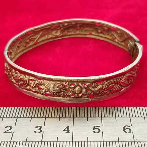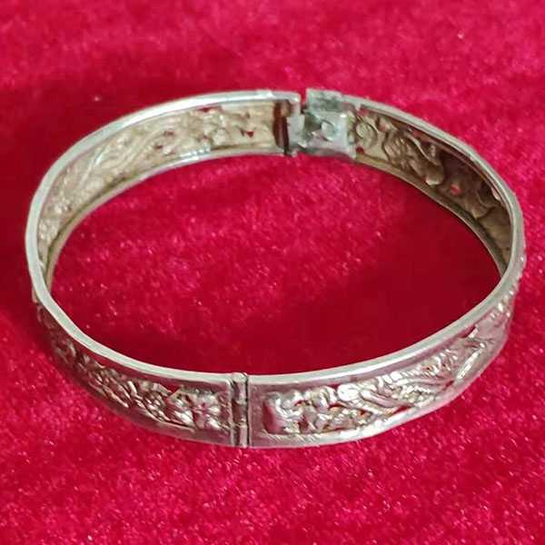 此龙凤呈祥银手镯为纯银手工精制而成,纯度高银色正,设计古朴,工艺精湛,轻盈芊薄,巧夺天工,纹饰图案精致华美,保存完好,包浆自然厚重。表面雕刻龙凤呈祥图案,寓意祥瑞如意、吉庆平安、百年好合,具有祛邪避灾、祈福纳吉的风水理气功效。