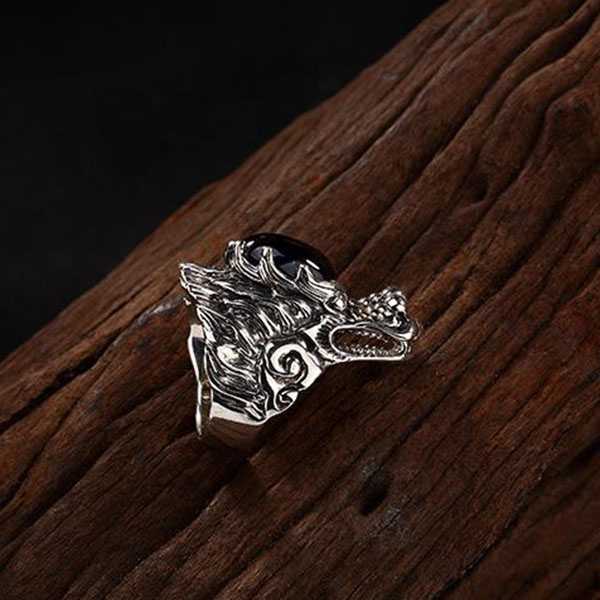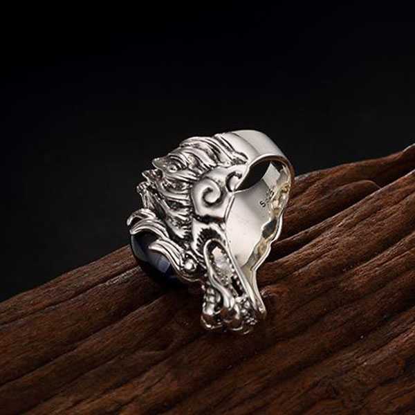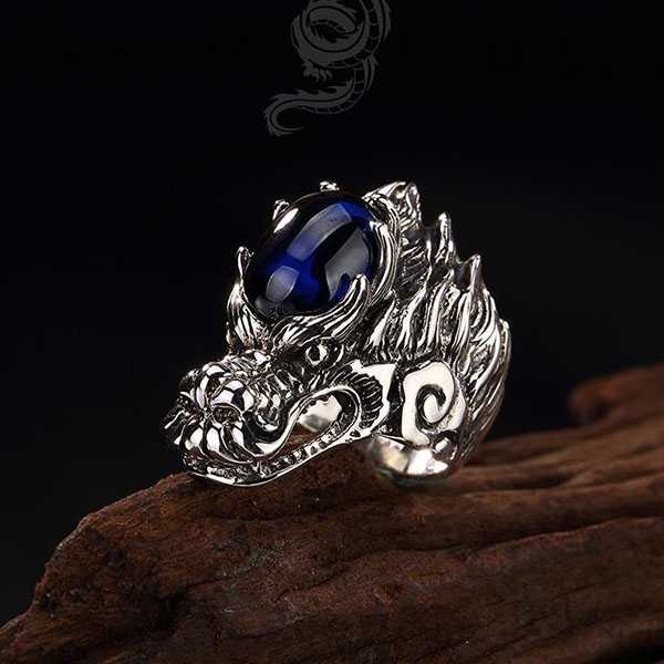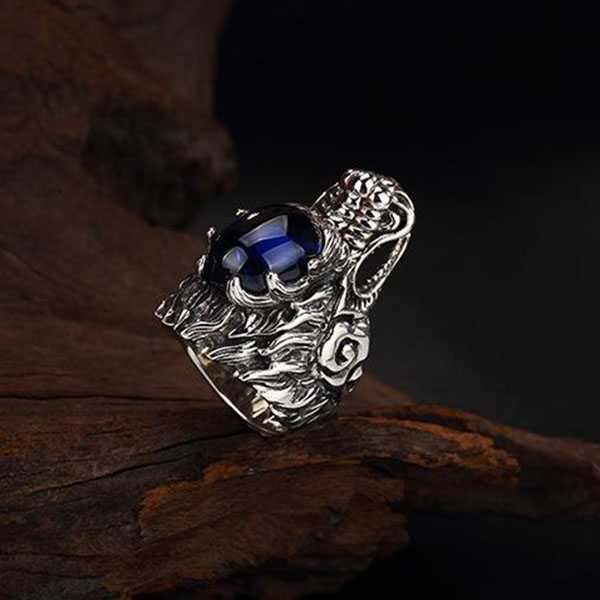 此纯银镶嵌蓝刚玉龙头戒指选用S925纯泰银和蓝刚玉,纯手工精制而成,银质纯净、光洁细腻,纹饰图案清晰均匀,设计精美霸气。其表面雕刻龙头纹饰,寓意祥瑞如意,具有祛邪避灾、祈福纳吉的风水理气功效。
