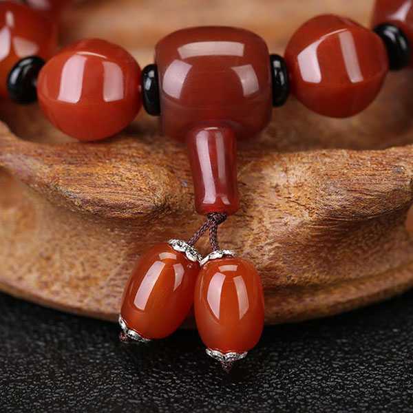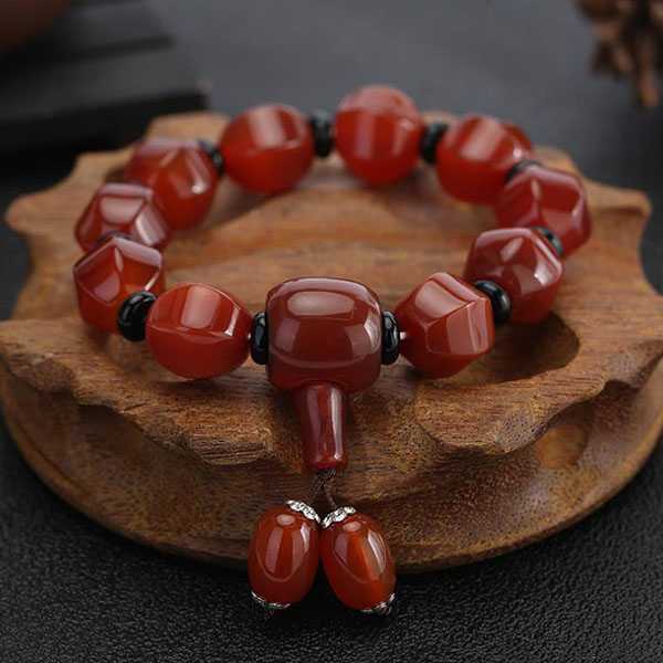南红玛瑙独特的“中国红”颜色符合中国人的审美,象征着喜庆吉祥,给人积极的心理暗示。《神发草本》描述玛瑙云:“除中热、润心肺、助声喉、滋毛发、养五脏、安魂魄、疏血脉、明耳目”。玛瑙中含有多种人体所需的矿物质元素,佩戴的时候,矿物质通过与皮肤的摩擦渗入体内,能够提高人体免疫力,改善内分泌和促进血液循环,达到安神明目、养颜保健的功效。