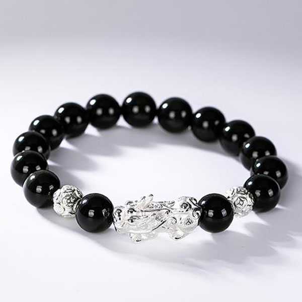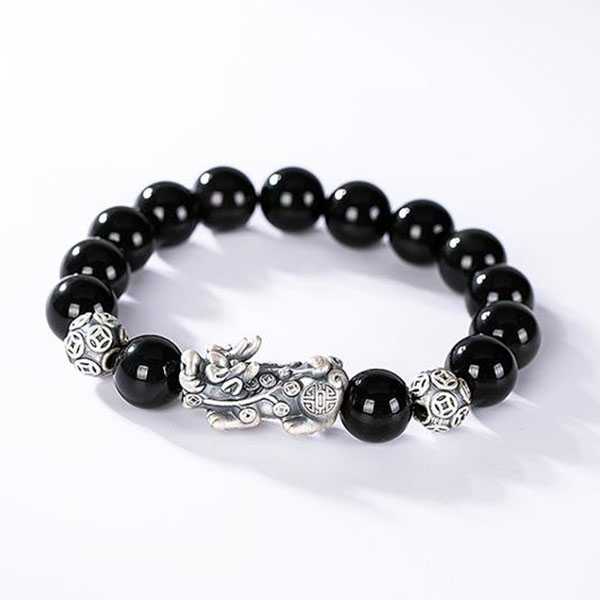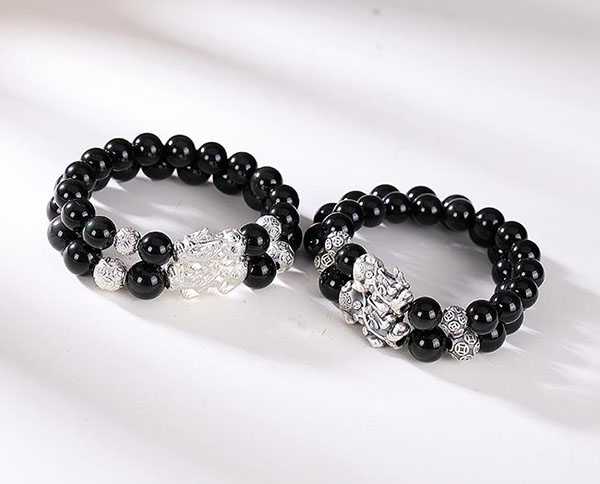 此纯银貔貅黑曜石手链选用S925纯银和天然黑曜石,纯手工精制而成。黑曜石瑙五行属水,对于八字喜用水者,具有提升气运、护佑平安和改善五行气势的作用。