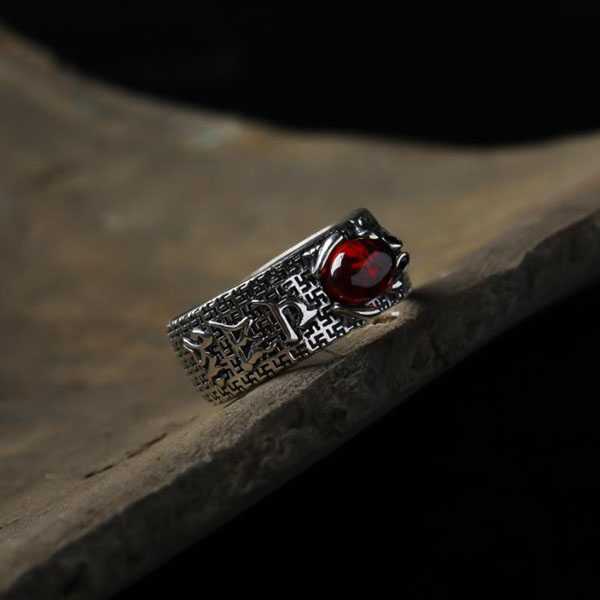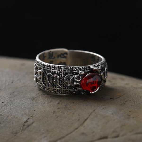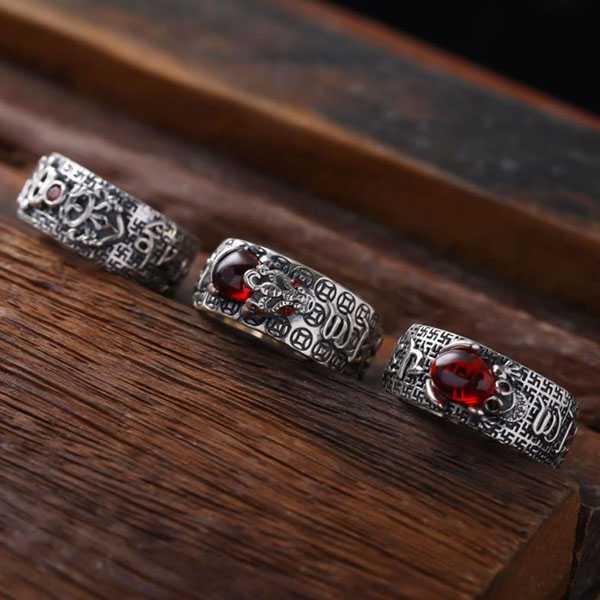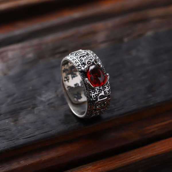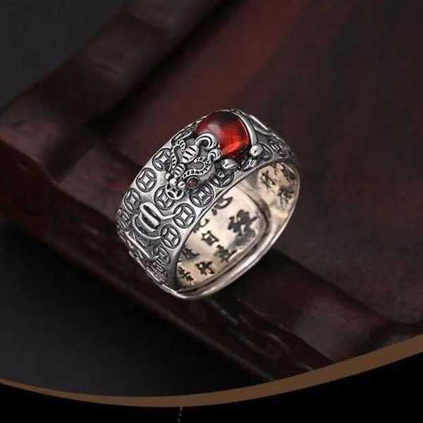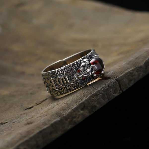 此纯银貔貅金蟾戒指选用S925纯银,镶嵌天然石榴石,纯手工精制而成,设计古朴简约,手感细腻。戒面雕刻招财貔貅、金蟾图案,寓意招财进宝、辟邪开运。