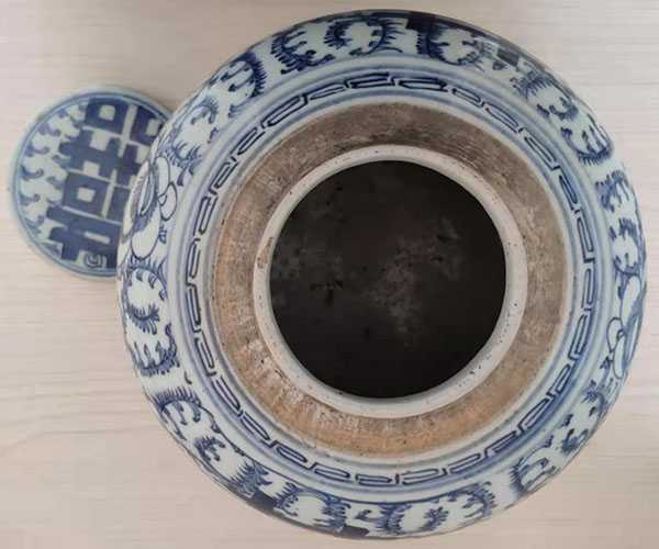 此青花喜字罐直口、丰肩、鼓腹,器型饱满,瓷胎洁白细密,釉质莹润,发色纯正,包浆均匀自然,画工精美,保存完整无磕无裂。罐身绘青花缠枝花纹,罐身双喜字,青花色泽青翠浓艳,蓝中隐紫,绘工精湛,寓意吉祥喜庆。