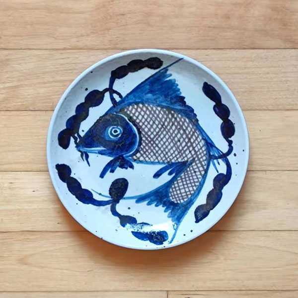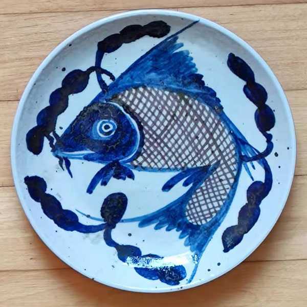 此青花鱼纹瓷盘工艺精细,形制规整,釉质温润,发色纯正,色泽青翠浓艳,蓝中隐紫,画工古朴大方,保存完整无磕无裂。盘面绘有鲤鱼图案,寓意吉庆有余、多子多福、生生不息。
